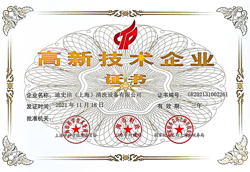 喜訊!喜訊!由上海市科學技術委員會、上海市財務局、國家稅務總局上海市稅務局聯合頒發的“國家高新技術企業”認定證書,由此迪史潔(上海)清洗設備有限公司,正式邁入國家高新技術企業行列。